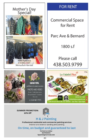 FOR RENT Mother’s Day Special! Commercial Space for Rent Parc Ave & Bernard 1800 s.f Please call 9090 Park Ave 514 843 7591 Menuchah Gerstel 438.503.9799 80