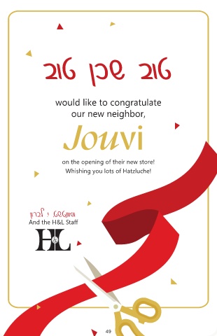 בוט ןכש בוט would like to congratulate our new neighbor, on the opening of their new store! Whishing you lots of Hatzluche! ןורבל .י ,טשטנואוו And the H&L Staff 49