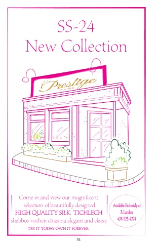 SS-24 New Co lection Come in and view our magni cent selection of beautifu ly designed Availa le Exclusivly at HIGH QUALITY SILK TICHLECH B. Landau sha bos vochen chasuna elegant and classy 438-525-4274 TRY IT TODAY OWN IT FOREVER 76