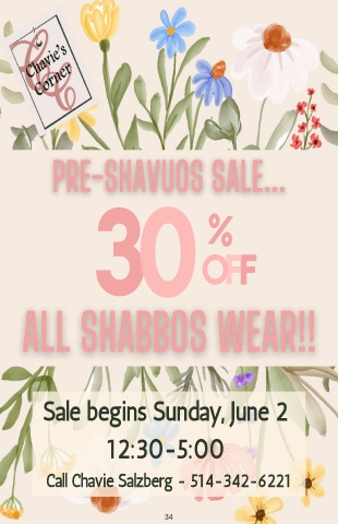 30 O F F % Sale begins Sunday, June 2 12:30-5:00 Call Chavie Salzberg - 514-342-6221 34