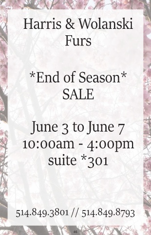 Harris & Wolanski Furs *End of Season* SALE June 3 to June 7 10:00am - 4:00pm suite *301 514.849.3801 // 514.849.8793 46
