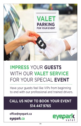 VALET PARKING FOR YOUR EVENT IMPRESS YOUR GUESTS WITH OUR VALET SERVICE FOR YOUR SPECIAL EVENT Have your guests feel like VIPs from beginning to end with our professional and trained drivers. CALL US NOW TO BOOK YOUR EVENT 514.447.9765 v alet 94