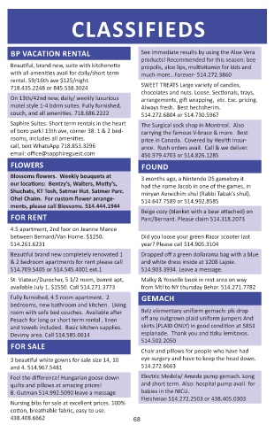 718.435.2248 or 845.538.3024 SWEET TREATS Large variety of candies, for those who can’t afford a new shaitel.