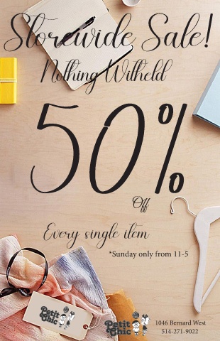Storewide Sale! Nothing Witheld 50% Off Every single item *Sunday only from 11-5 1046 Bernard West 514-271-9022 24