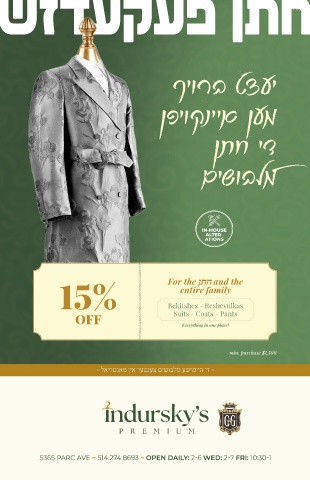 שזדעקעפ ןתח ךיורב טצעי ןפיוקנייא ןעמ ןתח יד םישובלמ IN-HOUSE ALTER- ATIONS 15% For the ןתח and the entire family Suits - Coats - Pants OFF Bekitshes - Reshevulkas Everything in one place! min. purchase $1,500