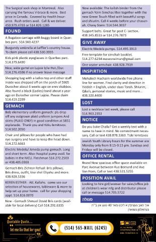 Burgundy umbrella at Leffler’s country house. Electric Medela pumps. 514.495.3913 work, etc. roof repairs. Joseph 514.891.3690. Yiddish, English & French. 438.493.4919