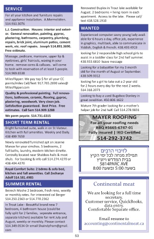 work, etc. roof repairs. Joseph 514.891.3690. Yiddish, English & French. 438.493.4919
