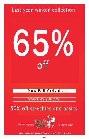 Last year winter collection 65% off New Fall Arrivals 50% off strechies and basics 44