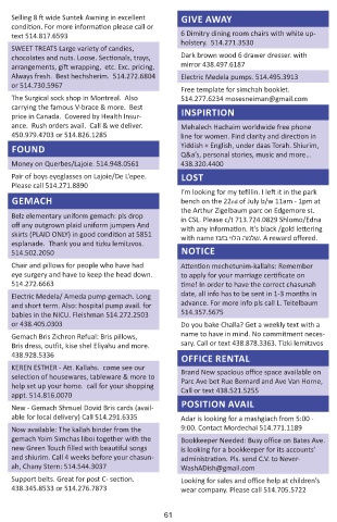 514.553.5900 4 car wheels and a 7 cubic chest freezer. Gemach Bris Zichron Refual: Bris pillows, name to have in mind. No commitment neces-
