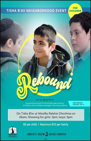 On Tisha B’av at Mesifta Reishis Chochma on Ekers. Showing for girls: 3pm, boys: 5pm 44