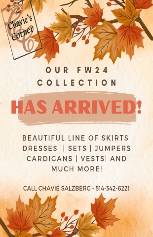 O U R F W 2 4 C O L L E C T I O N HAS ARRIVED! BEAUTIFUL LINE OF SKIRTS DRESSES | SETS | JUMPERS CARDIGANS | VESTS| AND MUCH MORE! CALL CHAVIE SALZBERG - 514-342-6221 49