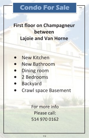 F o d o r l e a S n o C Condo For Sale ד"סב First floor on Champagneur between Lajoie and Van Horne • New Kitchen • New Bathroom • Dining room • 2 Bedrooms • Backyard • Crawl space Basement For more info Please call: 514 970 0162 112