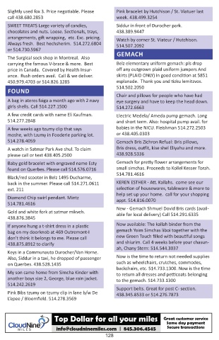 found on Querbes. Please call 514.576.0716 small simchas. Proceeds to Kollel Kesser Torah.