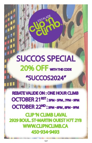 SUCCOS SPECIAL 20% OFF WITH THE CODE “SUCCOS2024” REBATE VALIDE ON : ONE HOUR CLIMB OCTOBER 21 RST : 3PM 5PM , 7PM 9PM ND OCTOBER 22 : 3PM 6PM , 8PM 9PM CLIP ‘N CLIMB LAVAL 2929 BOUL. ST MARTIN OUEST H7T 2Y8 WWW.CLIPNCLIMB.CA 450 934 9493 107