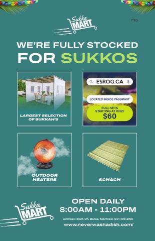 Sukka " WE’RE FULLY STOCKED FOR SUKKOS ESROG.CA LARGEST SELECTION OF SUKKAH’S OUTDOOR HEATERS SCHACH Sukka 8:00AM - 11:00PM OPEN DAILY Address: 3025 Ch. Bates, Montréal, QC H3S 2W8 www.neverwashadish.com/ 138
