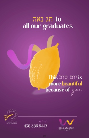 האנ גח to all our graduates This בוט םוי is more beautiful because of you BE THE NEXT TO GRADUATE -Kaila UPCOMING COURSE RIGHT AFTER YOM TOV 438.389.9447 KAILA ACADEMY Waves of opportunity 139