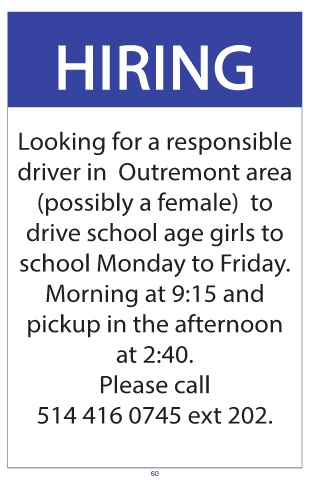 HIRING Looking for a responsible driver in Outremont area (possibly a female) to drive school age girls to school Monday to Friday. Morning at 9:15 and pickup in the afternoon at 2:40. Please call 514 416 0745 ext 202. 60