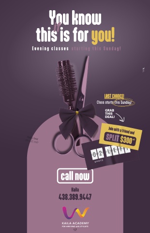 You know if this is for you! Evening classes s t arting this Sunday! LAST CHANCE! Class starts this Sunday! GRAB THIS DEAL! Malky Gross 514.267.1437 call now Kaila 438.389.9447 KAILA ACADEMY FOR HAIR AND WIG STYLISTS 17