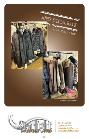 ’’ super special rack starting at $500 While quantities last. 514.843.7591 9090 Park Ave info@starlightfurs.com www.starlightfurs.com 22
