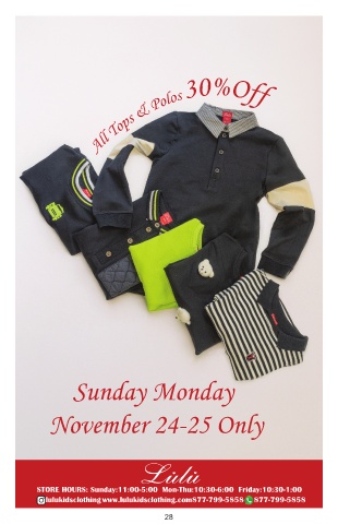 All Tops & Polos 30%Off Sunday Monday November 24-25 Only STORE HOURS: Sunday:11:00-5:00 Mon-Thu:10:30-6:00 Friday:10:30-1:00 lulukidsclothing www.lulukidsclothing.com877-799-5858 877-799-5858 28