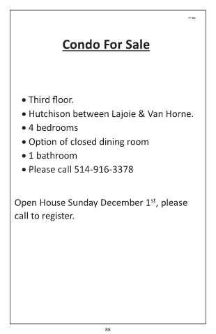 ד״סב Condo For Sale • Third floor. • Hutchison between Lajoie & Van Horne. • 4 bedrooms • Option of closed dining room • 1 bathroom • Please call 514-916-3378 Open House Sunday December 1 , please st call to register. 86