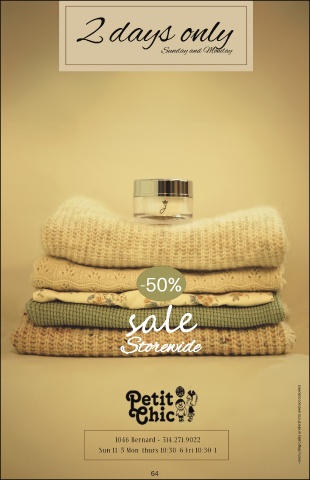 2 days only Sunday and Monday -50% Storewide *excluding baby undershirts and accessories 1046 Bernard • 514.271.9022 Sun 11-5 Mon-thurs 10:30-6 Fri 10:30-1 64