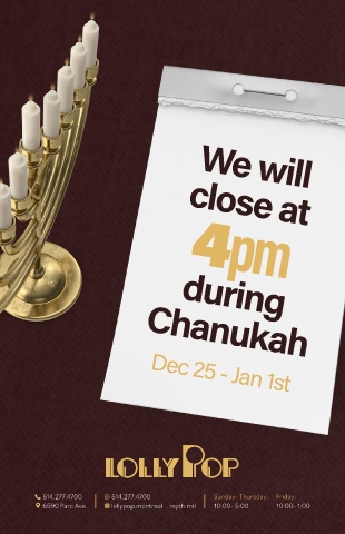 We will close at 4pm during Chanukah Dec 25 - Jan 1st 32