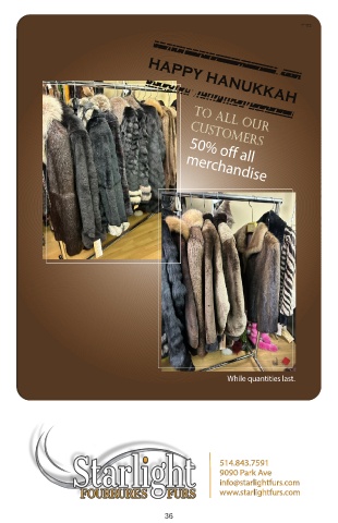 ’’ happy hanukkah to all our customers 50% off all merchandise While quantities last. 514.843.7591 9090 Park Ave info@starlightfurs.com www.starlightfurs.com 36