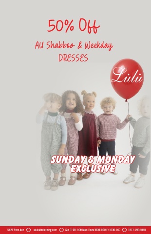 50% Off All Shabbos & Weekday DRESSES Sunday & Monday Exclusive 5421 Parc Ave lulukidsclothing.com Sun 11:00 - 5:00 Mon - Thurs 10:30 - 6:00 Fri 10:30 -1:00 1877 -799-5858