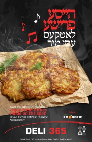 עסייה עשירפ סעקטאל רימ ןסע From now until after Chanukah, enjoy fresh latkes made on the spot Only at: at our special station in Fooderie Supermarket! 514.544.DELI(3354) At Fooderie Market 6680 PARK AVE 107