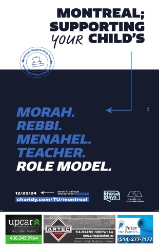 MONTREAL; SUPPORTING YOUR CHILD’S MORAH. REBBI. MENAHEL. TEACHER. ROLE MODEL. / / Invest in chinuch that dares for greatness charidy.com/TU/montreal 514-223-8705 5999 Parc Ave www.artecplanchers.ca Ceramic // Vinyl // Hardwood // Laminate