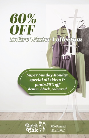 60% OFF Entire Winter Collection Super Sunday Monday special all skirts & pants 50% off denim, black, coloured 1046 Bernard 514.271.9022 32