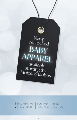 Newly restocked available starting this Motzei Shabbos Open this Motzei Shabbos Dec. 21 | 7:00-11:00 pm 6590 Parc Ave Sun–Thur: Friday: 514.277.4700 10:00-5:00 10:00-1:00 9