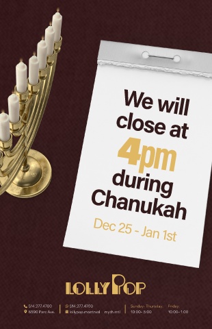 We will close at 4pm during Chanukah Dec 25 - Jan 1st 14