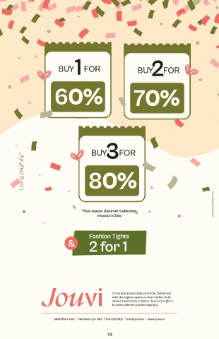 1 2 BUY FOR BUY FOR 60% 70% + 3 BUY FOR 80% simikdesign@gmail.com *Past season Summer Collection inluded in Sale & 5686 Park Ave. | Montreal, QC H2V | 514.272.9327 | info@jouvi.ca | www.jouvi.ca 18