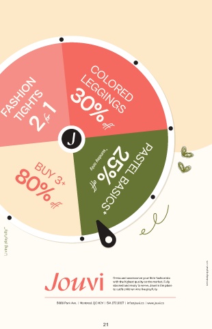 FASHION BUY 3+ 30% f 25% f PASTEL BASICS* TIGHTS COLORED 2 for 1 LEGGINGS *sunday only 80% f simikdesign@gmail.com 5686 Park Ave. | Montreal, QC H2V | 514.272.9327 | info@jouvi.ca | www.jouvi.ca 21