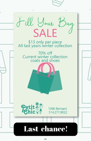 Fi Your Bag SALE $13 only per piece All last years winter collection 70% off Current winter collection coats and shoes 1046 Bernard 514.271.9022 Last chance! 24