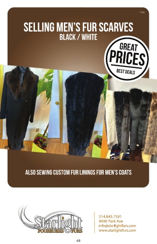 ’’ Selling Men’s fur scarves Black / white Great Prices best deals Also Sewing Custom fur linings for men’s coats 514.843.7591 9090 Park Ave info@starlightfurs.com www.starlightfurs.com 48