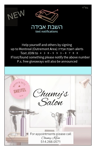 NEW ד’’סב Chumy’s Salon For appointments please call Chumy Klein 514.268.0571