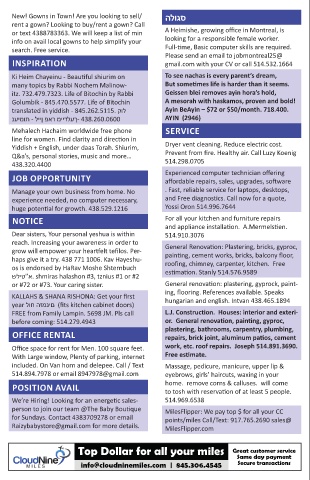 haps give it a try. 438 771 1006. Kav Hayeshu- roofing, chimney, carpenter, kitchen. Free 438.765.4214