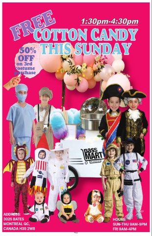 FREE 1 1:30pm-4:30pm 0 p p : 3 m 3 0 : - 4 m COTTON CANDY 50% THIS SUNDAY OFF on 3rd costume purchase ADDRESS: 3025 BATES HOURS: MONTREAL QC, SUN-THU 9AM-9PM CANADA H3S 2W8 FRI 9AM-4PM 40 Inside left Inside right