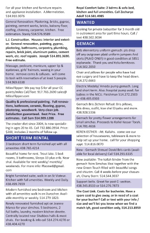 and appliance installation. A.Mermelstien. kitchen and full amenities. Call Zecharye