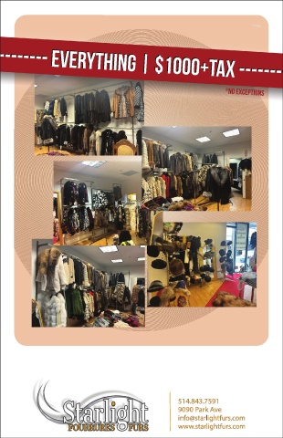60% OFF ’’ --------------------- Everything | $1000+tax -------------------- --------------------- Everything | $1000+tax -------------------- *no exceptions 514.843.7591 9090 Park Ave info@starlightfurs.com www.starlightfurs.com 100
