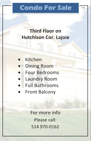 F o d o r l e a S o n C Condo For Sale ד"סב Third Floor on Hutchison Cor. Lajoie • Kitchen • Dining Room • Four Bedrooms • Laundry Room • Full Bathrooms • Front Balcony For more info Please call: 514 970-0162 60