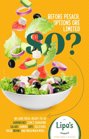 Before Pesach, options ore limited We have fresh, ready-to-go sandwiches, Lipa’s signature salads, famous dips, delicious, fresh drinks and much much more... 113 5573 Park Ave, Montreal, QC // 514.272.6732