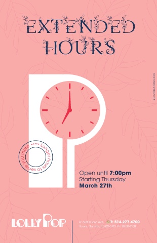 BLITZCREATIONS.COM ••••• Longer hours to serve you more Open until 7:00pm Starting Thursday March 27th A: 6590 Parc Ave T: 514.277.4700 Hours: Sun-thu 10:00-5:00 Fri 10:00-2:00 60